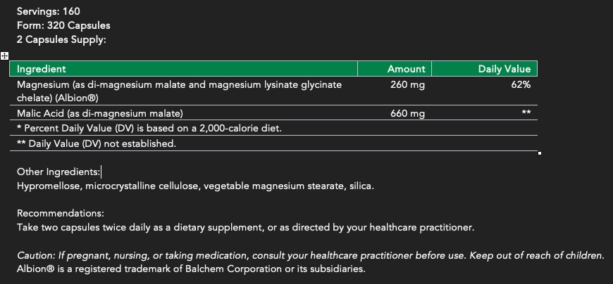 OptiMag Complete is formulated with highly absorbable chelated magnesium, as patented TRAACSTM (magnesium lysinate glycinate chelate), and added malic acid for additional health benefits.